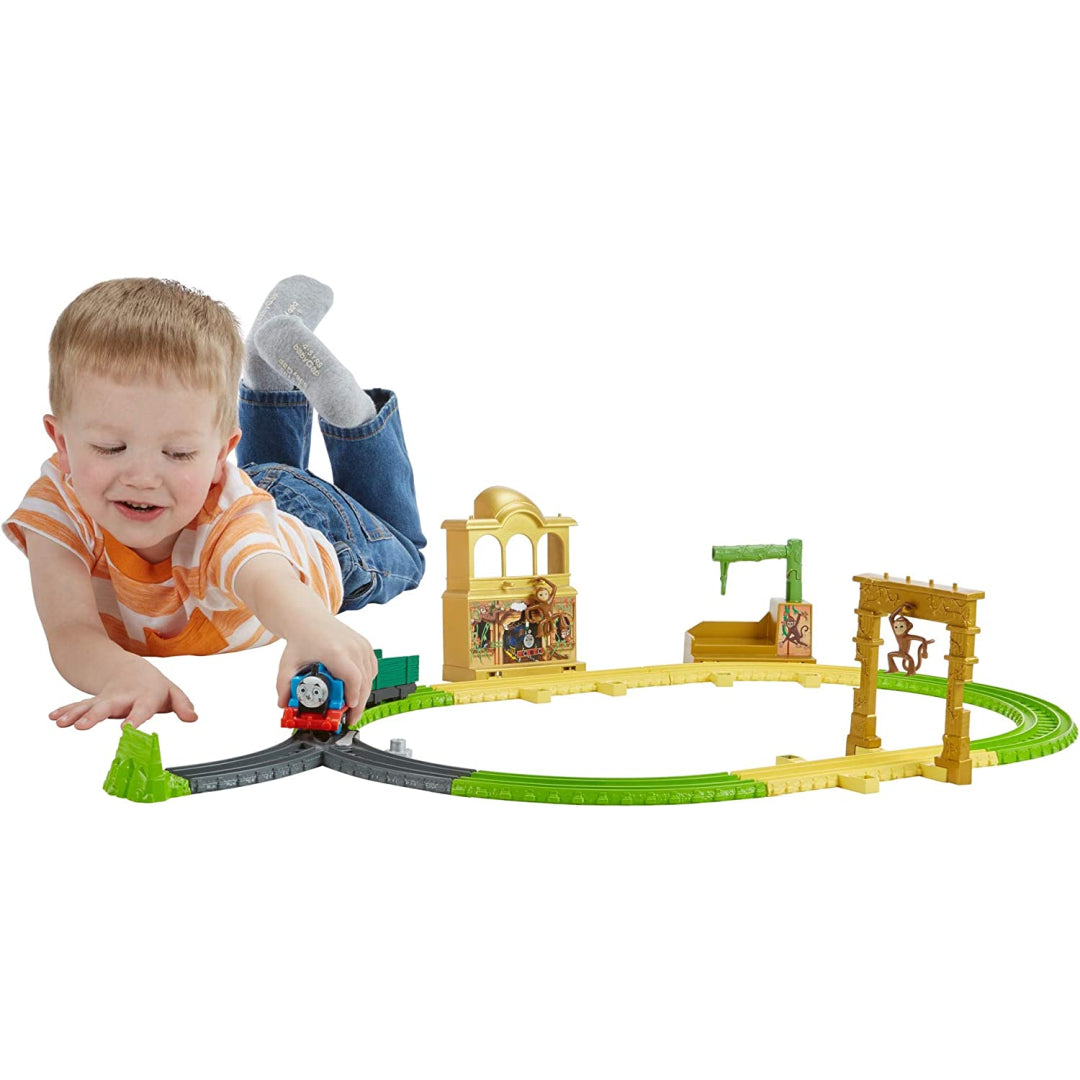 Children are able to participate in a world of play that is influenced by the Thomas and Friends television programme thanks to the Track Master Monkey Palace Set. Thomas makes a special trip to the Monkey Palace in India for an episode of the show. While there, he witnesses some monkeys being separated from their families. Watch as your child Thomas fan follows along with anticipation as Thomas travels below the tree branch with a monkey in his freight car, and then the happy chimp grabs onto the limb and swings back towards his pals! In addition to this, the monkeys are able to swing from the gantry and stand on the palace. Children will have a lot of fun coming up with exciting wildlife adventures for Thomas and his other ape friends to go on. The push-along metal engines included with Track Master provide many additional ways to play, and they are compatible with Track Master track. (Engines are not included and must be purchased separately; availability varies).