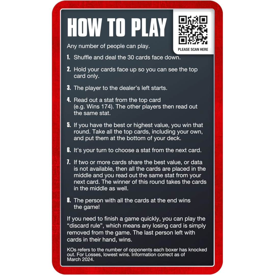 A fun and instructive card game that makes your favourite topics come to life! You may play Top Trumps with as many people as you like, at any time, anyplace. Find out amazing statistics like the number of bouts Sugar Ray Robinson fought or the number of KO victories Anthony Joshua has had. You have no restrictions on where you may play thanks to the portable plastic enclosure. Become the Top Trump by outwitting your rivals, learning fascinating new information, and engaging in duelling!