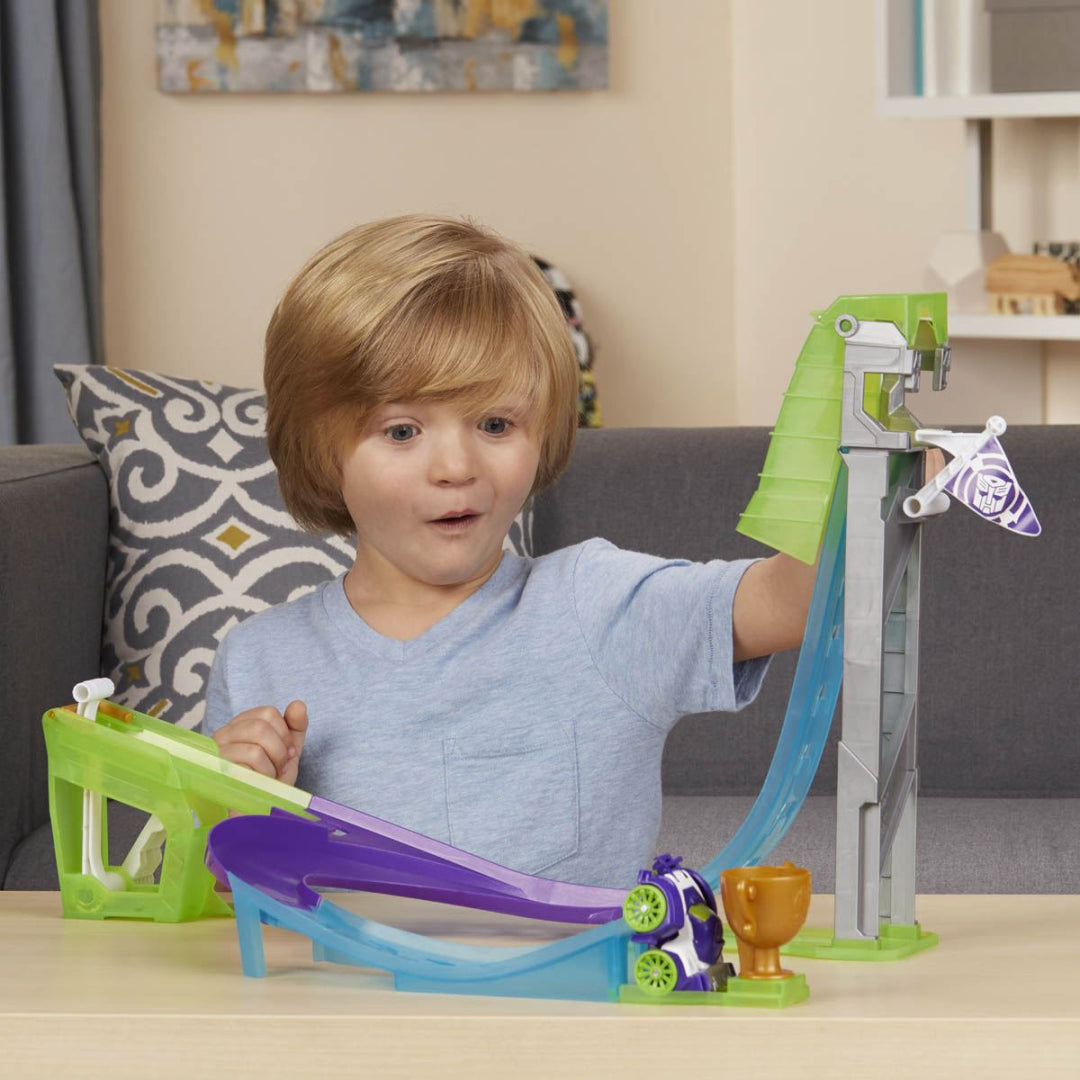 Get ready for epic playtime thrills with the Transformers Blurr Reverse Raceway Rescue Bots! Perfect for budget-savvy parents looking for toys that pack multiple play features into one awesome set. Watch as Blurr zooms down the turret track to the landing platform, with an amazing automatic transformation from vehicle to robot mode at the tower's peak. The reverse mode adds extra excitement, letting your little ones watch Blurr trek backwards and forwards along the track.