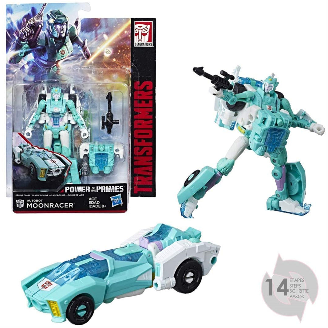 Through the use of the premium deluxe Moonracer figurine, you may exert influence on the strength of a bonus. Through the use of the premium deluxe Moonracer figurine, you may exert influence on the strength of a bonus. This figure is 14 centimetres in length and comes with prime protected components. When you transform this deluxe into robot mode, the action figures of Premium Master attach themselves on the primary shield piece (extra bonus figures may be purchased separately). Depending upon availability).