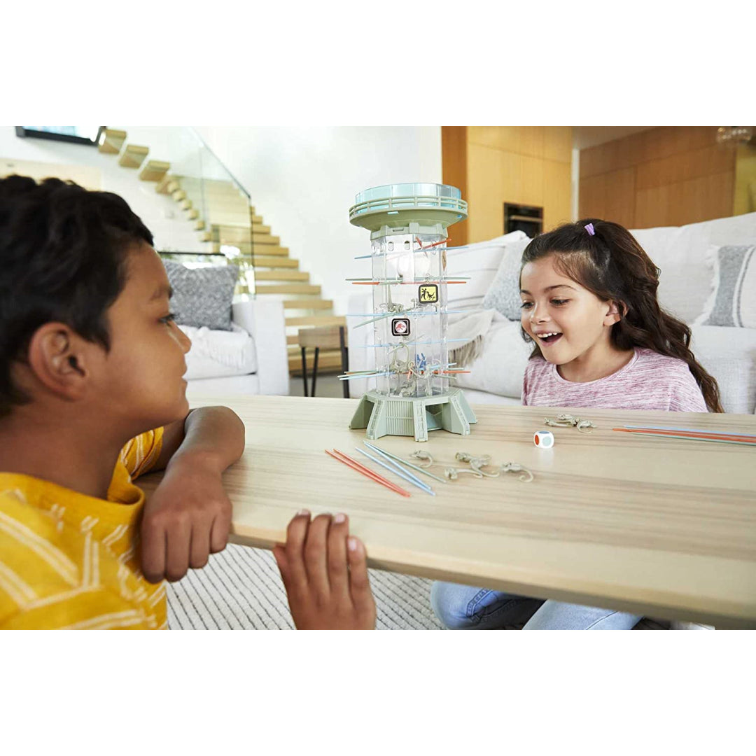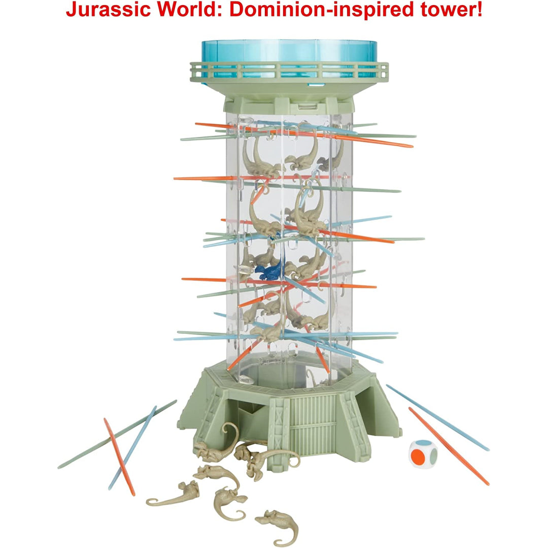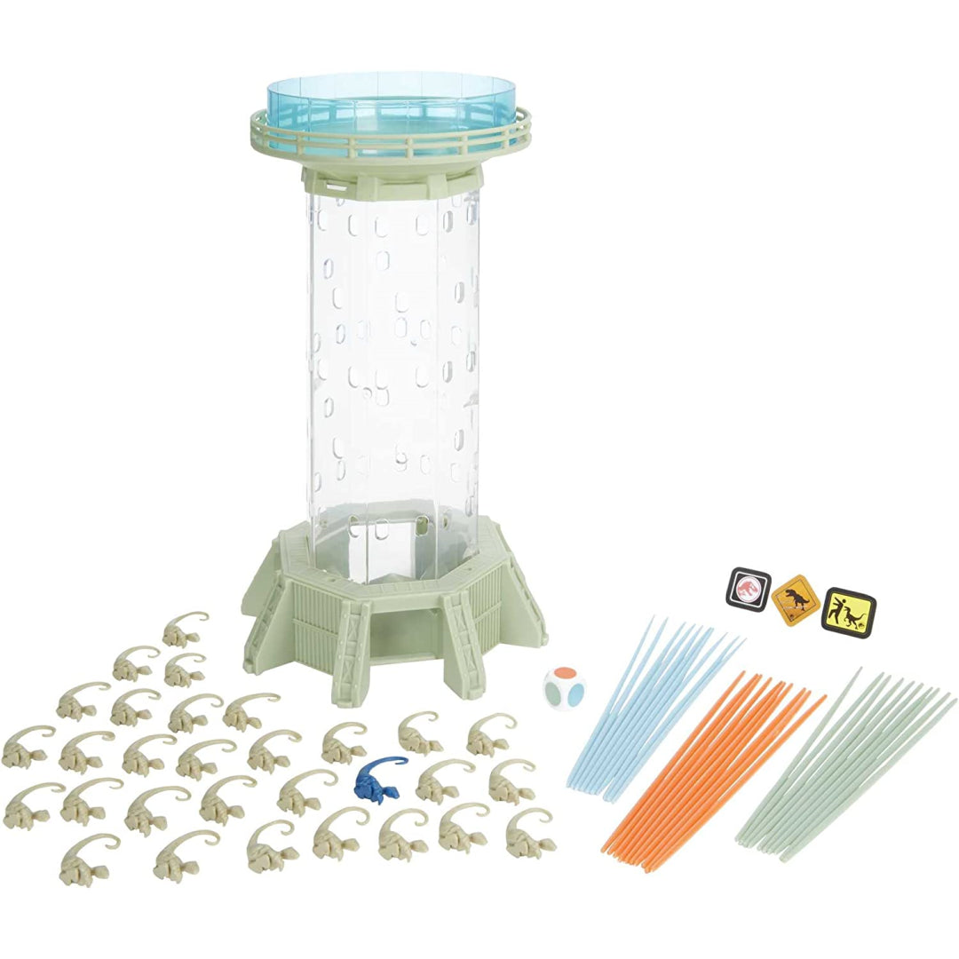 Don't let the dinosaurs get loose! The velociraptor dinosaur pieces are stored in the tower that has a movie theme. Players take turns pulling sticks from the tower while attempting to prevent the raptors from "escaping" the structure. Players are motivated to continue playing by their desire to achieve success. Are you willing to rise to the occasion?