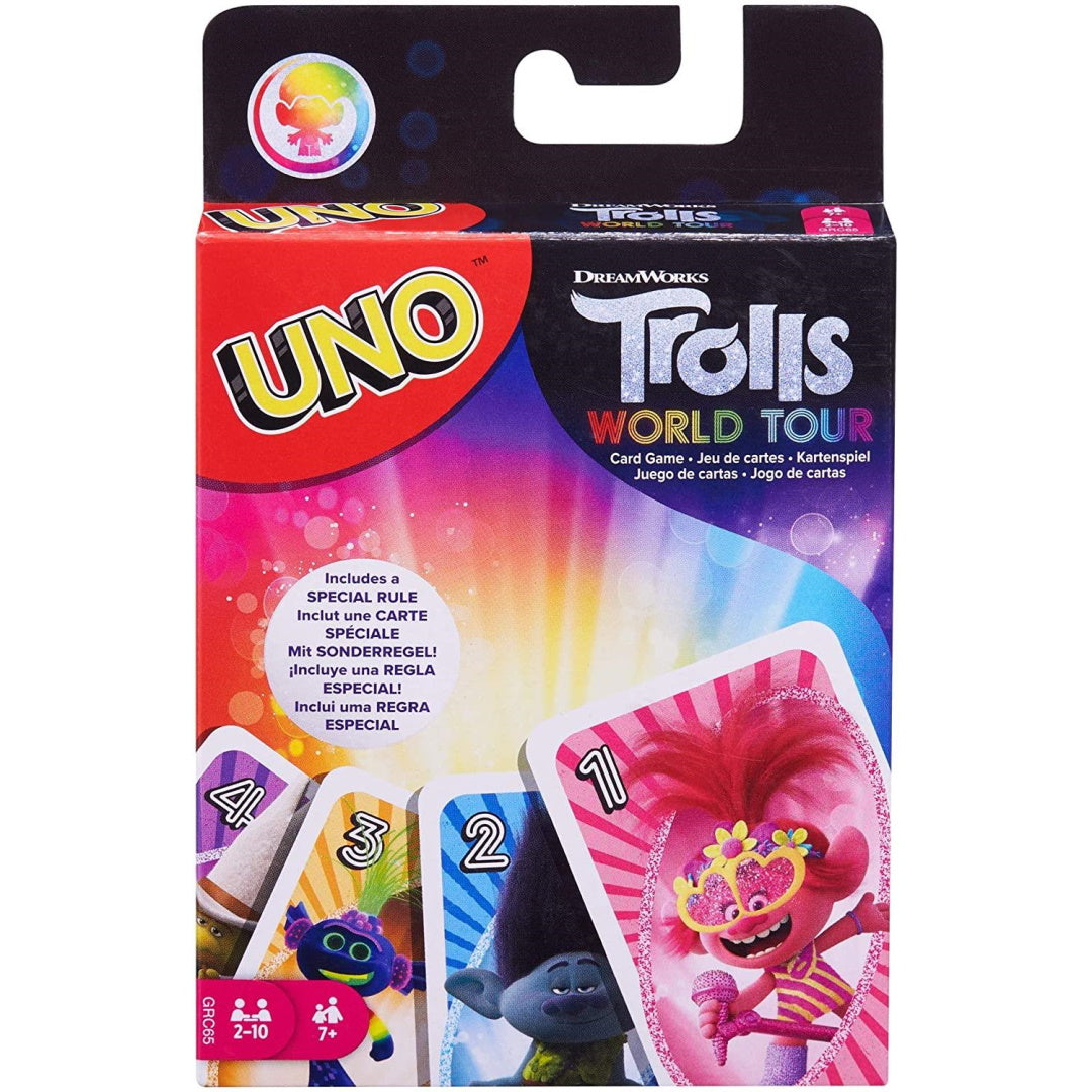 The matching card game you know but with classic characters from the Trolls movie sequel. Dreamworks Trolls World Tour UNO features a unique rule in each deck related to the Troll universe. Players race to get rid of all their cards by matching a card in their hand with the current card shown on top of the deck. When you're down to one card, don't forget to channel the trolls and happily yell "UNO"