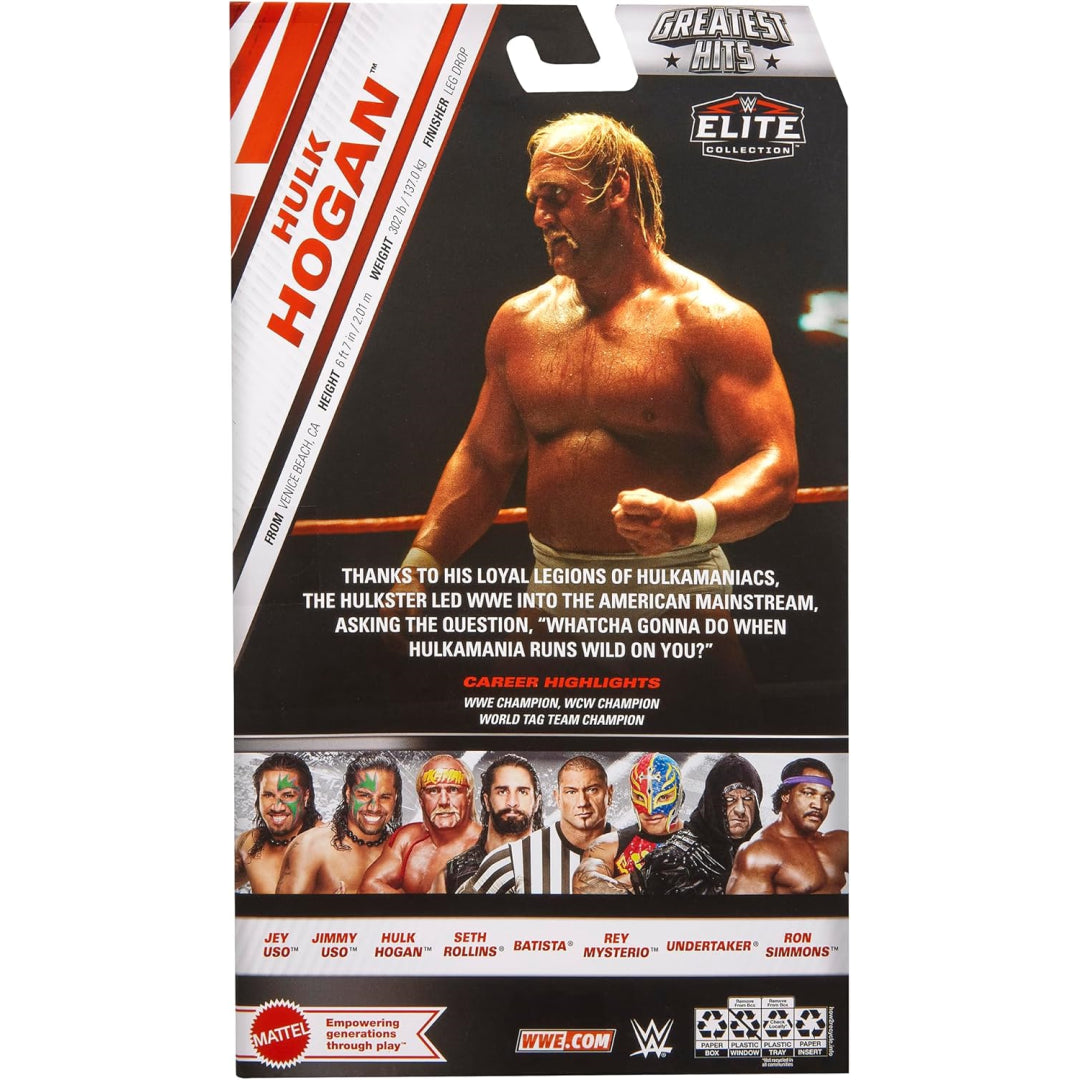 Experience the ultimate WWE collectible with the Elite Collection Hulk Hogan action figure, featuring authentic 6-inch scale design, premium articulation, and lifelike TrueFX facial details that bring the wrestling legend to life. This highly detailed figure comes complete with iconic ring gear and accessories, perfectly capturing the Hulkster's signature look and championship legacy. Perfect for WWE fans, collectors, and wrestling enthusiasts looking to recreate classic matches and poses from the golden era of sports entertainment. Additional WWE Elite figures available separately.
